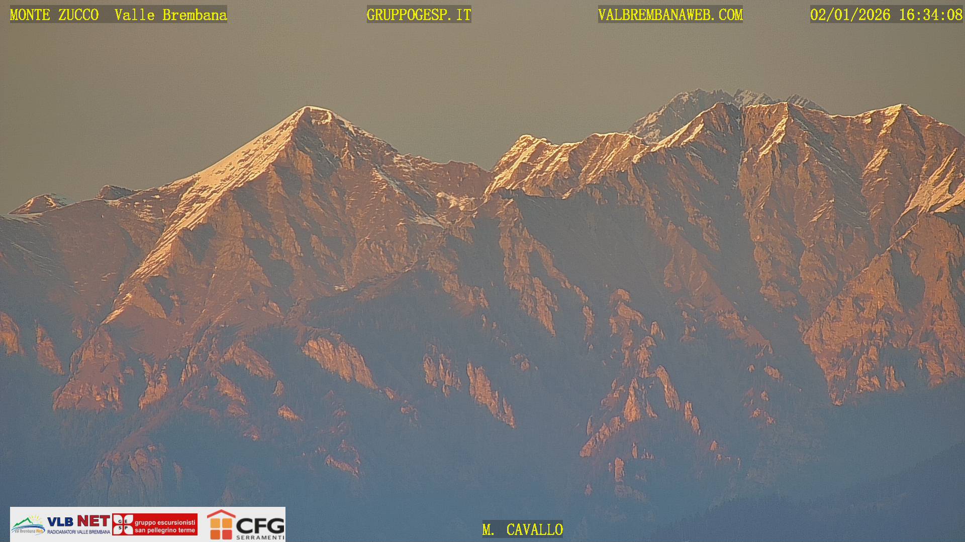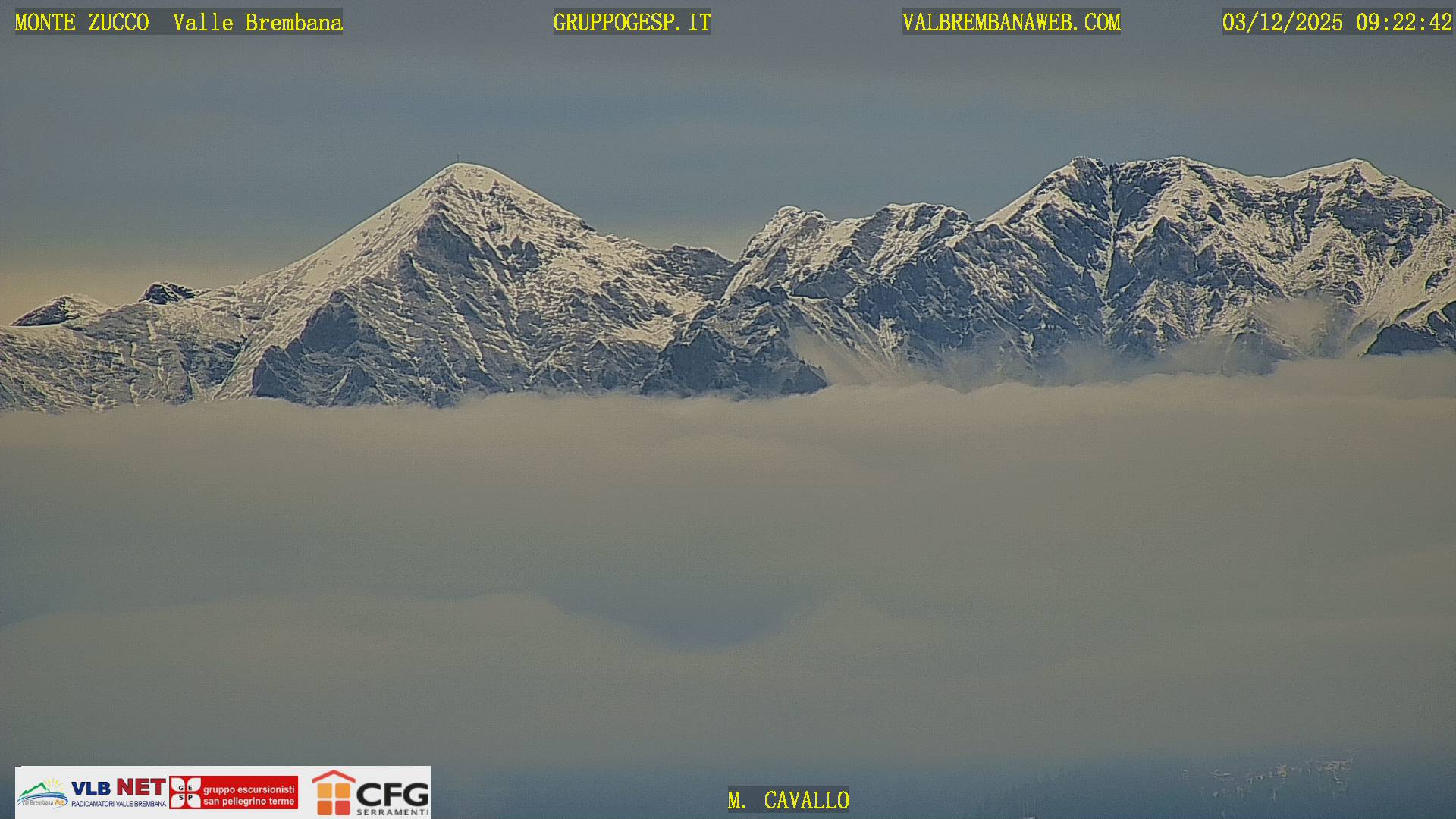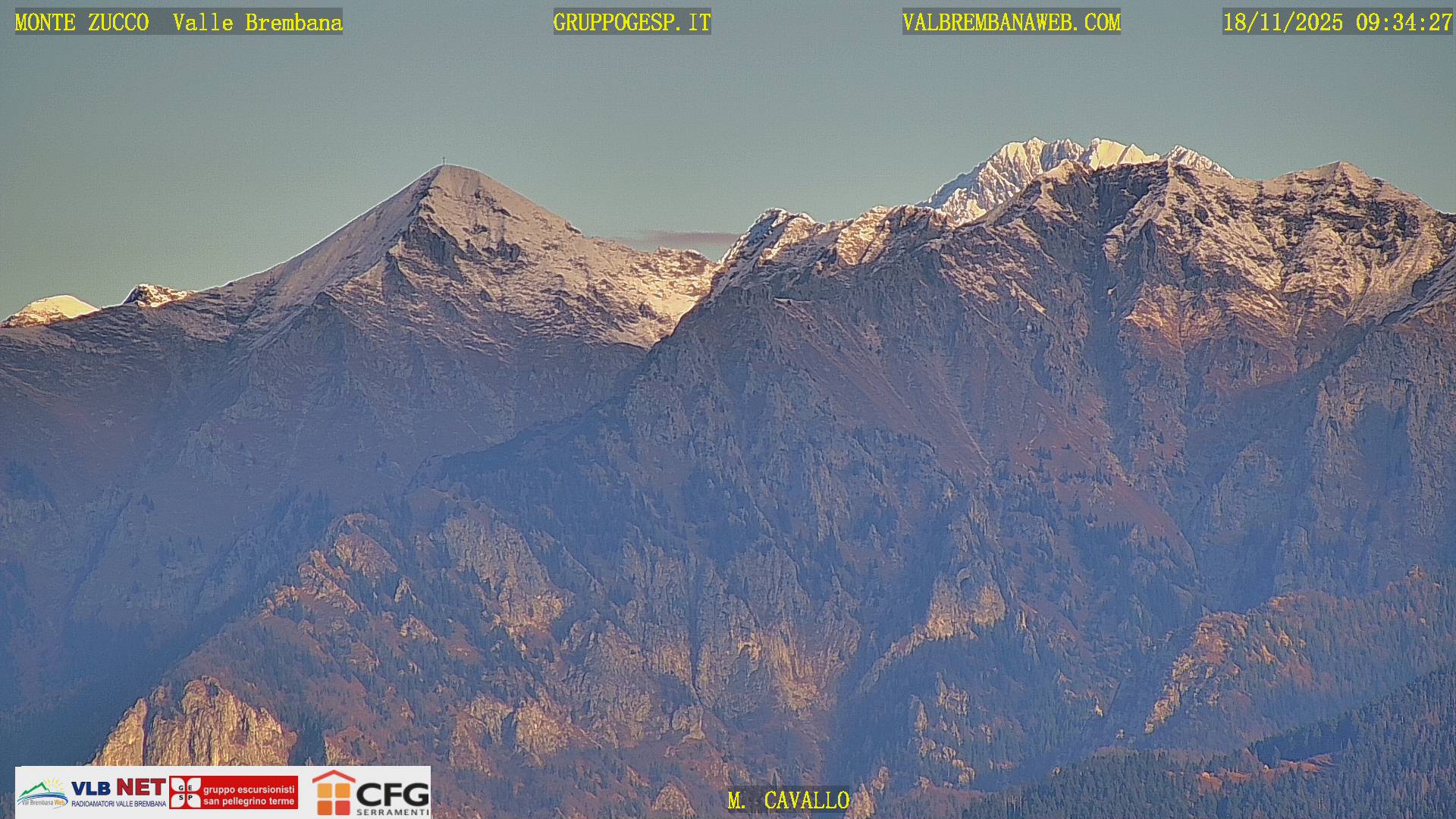 Webcam Monte Zucco – M. Cavallo e Pizzo Cavallino, in secondo piano vetta Monte Disgrazia, in basso a destra Arco del Pegherolo